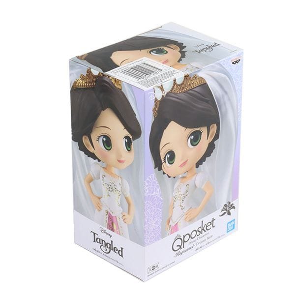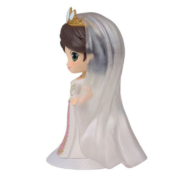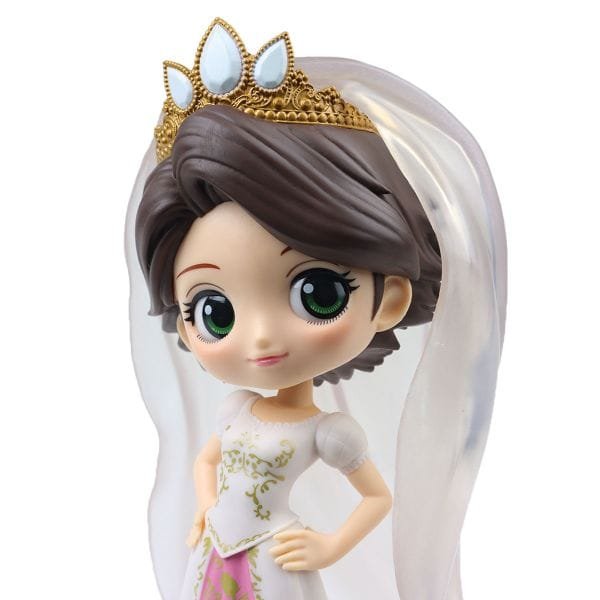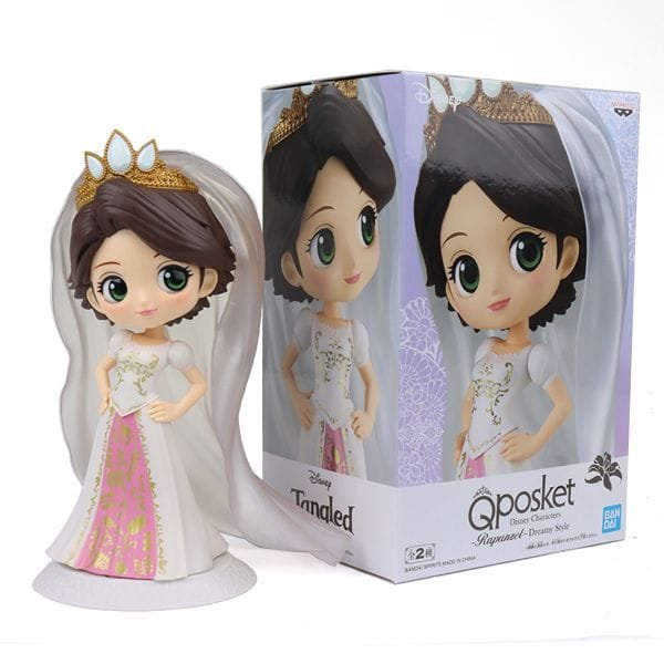 Princesa Rapunzel se junta à linha de bonecos de personagens da Disney Q Posket mais uma vez, desta vez em um estilo de sonho! A princesa tem cerca de 14 centímetros de altura em um vestido de noiva branco creme com seu esquema de cores normal.